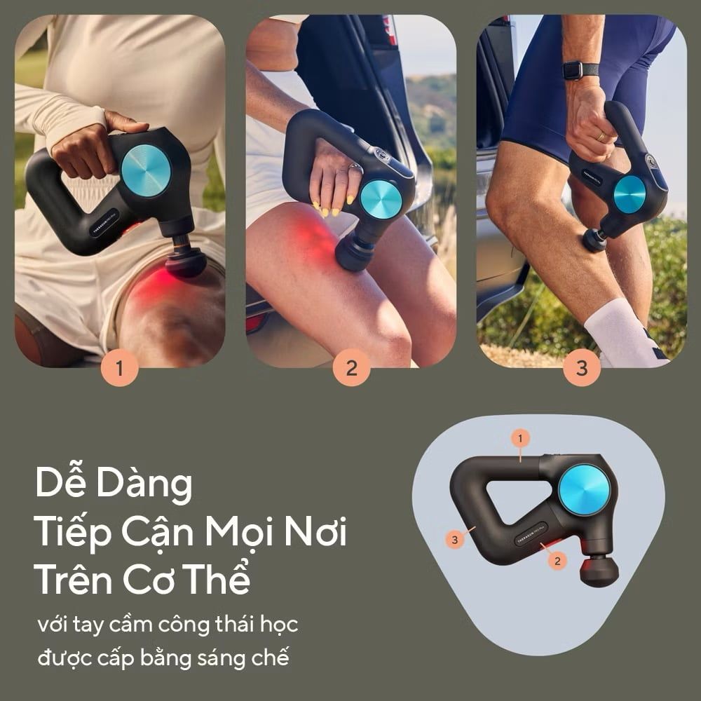 Thiết kế công thái học độc quyền (Patented Ergonomic Triangular Design): Thiết kế hình tam giác đặc trưng của Theragun giúp người dùng dễ dàng tự thao tác massage ở nhiều vị trí trên cơ thể, kể cả những vùng khó tiếp cận ở lưng.