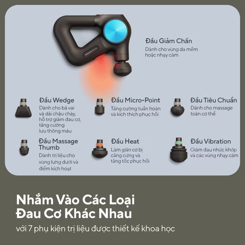 Phụ kiện đa dạng: Đi kèm 5 đầu massage được thiết kế khoa học (Dampener, Standard Ball, Thumb, Micro-point, Wedge) phục vụ cho các vùng cơ và mục đích trị liệu khác nhau.