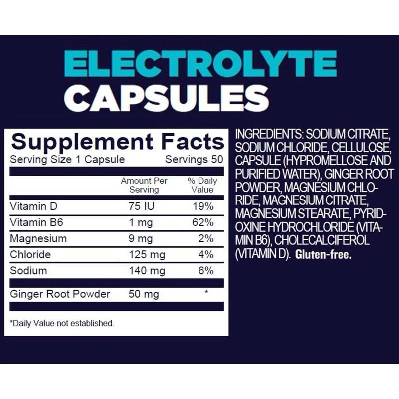THÔNG TIN SẢN PHẨM * Hộp 50 viên * Dạng viên nang mềm tiện dụng * Cung cấp dồi dào nguồn chất điện giải bao gồm Natri, Magie và muối Clorua * Cân bằng lượng nước trong và ngoài tế bào * Không chứa Kali, không chứa Gluten * Thay thế cho các thành phần bị mất đi do thoát mồ hôi * Chống lại hiện tượng mất nước, co cơ và chuột rút * Kết hợp sử dụng được với các loại thực phẩm dinh dưỡng khác